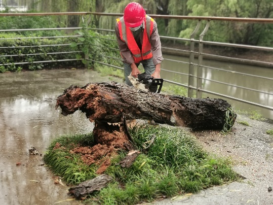 “梦都大街向阳河边有一株倒伏柳树,需要支援。”党员们闻令而动,迅速赶往树木倒伏点,因大半截树木主杆已倒至护栏外,大家用绳索固定好主杆,一名绿化工人切割断枝,志愿者们拽住绳索,因主杆太重,断截的树木落入水中,志愿者们又协助绿化工人们一起,齐心协力将断截的主杆拉上了岸。抢险倒伏树木后,大家接着巡查、清理断枝,雨水挡不住志愿者们的工作热情,大家在志愿之余,更是体会到一线绿化养护人员的不易。