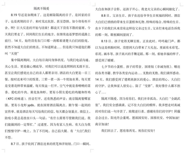 集中医学观察即将结束前,酒店工作人员收到了一份饱含深情的离别“礼物”。这是一封来自刚刚结束观察生活、离开酒店顺利归家的市民朋友的感谢信,他用朴实真挚的语言回顾了与家人在酒店里生活的点点滴滴,表达了对集中观察点指挥部、各工作组及国青酒店的感谢与祝福。