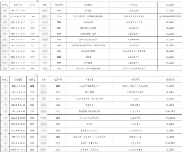 “3323房间需要辣椒酱或老干妈”、“2420房间需要免洗洗手液”、“3903房间住客喉咙不舒服需要药”……客服中心每天都会接到各种特殊的需求并一一做好记录,及时联系相关同事协助采买、送达。