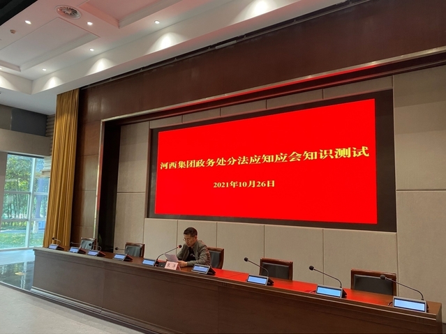 2021年10月26日下午,河西集团监察专员办公室开展警示教育活动,组织集团本部处级干部及下属子企业领导班子成员进行《中华人民共和国公职人员政务处分法》应知应会知识测试。本次测试应到36人,实到34人,2人递交了书面请假材料,测试均分96分,学习宣贯效果良好。
