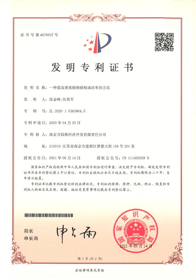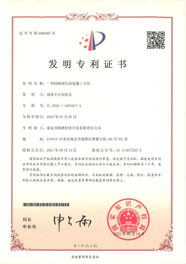 近日,hy5900cc海洋之神南京市园林经济开发有限责任公司喜获两项国家发明专利授权。