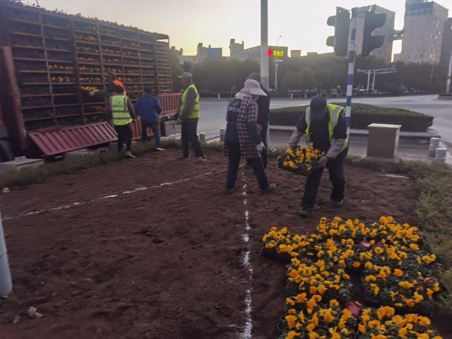 冬季的清晨,寒意逼人,园林工匠们却干的热火朝天。清理秋季草花、施肥整地,根据更换方案,对草花花色进行合理搭配,以求达到花色鲜艳、品种丰富的景观效果。在植物配置时,进行了图案设计,如河西大街长方形套图、乐山路、奥体大街花境设计布置等,构成了一幅幅灵动活泼的图画,不仅美化了城市景观效果,也为冬季出行的市民呈现了一道靓丽的风景线。
