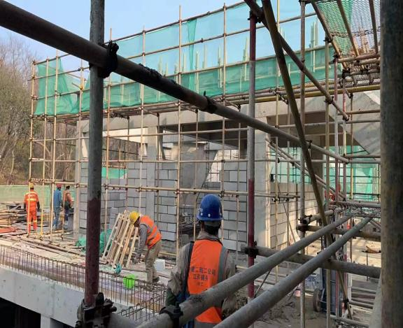 在紫金山庄配套设施扩改建项目现场,听到的是机器轰鸣、车辆喧嚣的声音,看到的是工作忙碌、干劲十足的景象,工人们正加紧二次结构的施工。