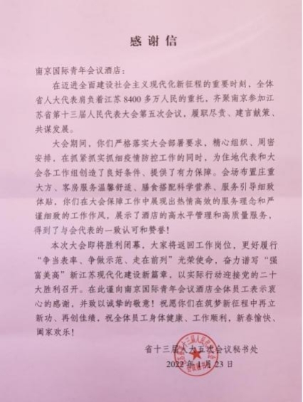 江苏省第十三届人民代表大会第五次会议于2022年1月20日至1月23日在南京召开。hy5900cc海洋之神青奥城公司国际青年会议酒店和金陵江滨酒店作为本次大会的重点接待单位,圆满完成了此次接待任务,获得与会代表的一致好评。