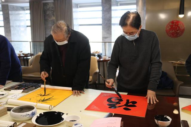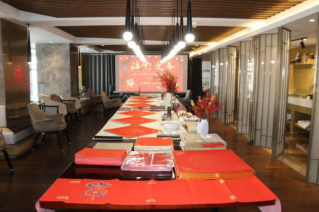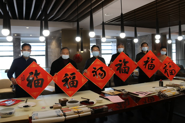 活动现场翰墨飘香,福气满堂。书画家们饱含热情,大家摆开书案,铺开大红纸,凝神提笔,挥毫泼墨。