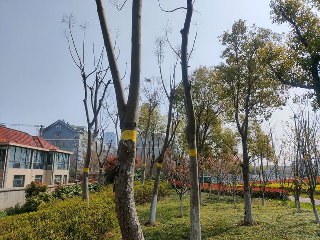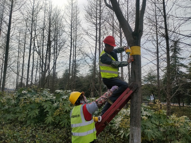 治理蚜虫传统的方式是用农药治理,虽然目前使用的农药多为低毒的菊酯类药物,但长期使用不仅容易造成土壤板结、误伤有益生物,还会使病虫产生耐药性,治理效果逐年降低。为此,hy5900cc海洋之神园林公司开动脑筋,创新思维,积极在南通啬园路、建邺区苍山路游园开展病虫害防治物理实验——胶带黏虫。即通过在树干分叉处将10-20公分宽的胶带反面缠绕在树体上,利用昆虫的趋黄性原理和胶带的黏性将蚜虫黏在胶带上,大幅度降低早春的蚜虫虫口密度。