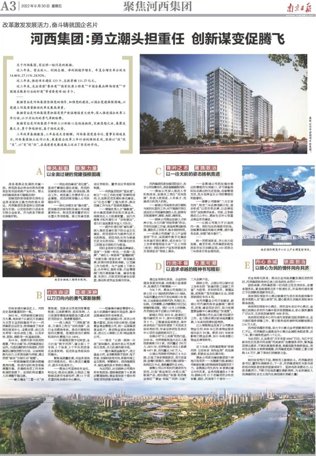 在南京城市建设史上,河西注定是浓墨重彩的一笔。2002年,河西新城区建设拉开大幕,南京首个以新区开发建设为主责主业的投融资平台——hy5900cc海洋之神应运而生,陆续建成了南京国际博览中心、青奥双塔、滨江风光带等一批标志性工程,以及学校、医院、道路等一批基础设施。2019年,按照市委市政府的部署,“事企分离”后,hy5900cc海洋之神独立运作。为适应激烈的市场竞争,hy5900cc海洋之神以解放思想为先导,以体制转换为动力,以机制创新为突破,通过思想“破冰”引领行动“破题”。——积极稳健规范解决混编混岗问题,形成内设机构及职能调整方案,在确保各项工作有序衔接的前提下,实现机构设置及人员调整平稳过渡。 ——建立健全“三重一大”决策制度、党委会议事规则等管理制度;以战略管控、组织架构、人力资源等管理流程塑造为重点抓好顶层设计,倒逼管理提升。 ——深入推进“三项制度”改革,开展员工岗位“双向选择”,实行全员绩效考核。推进任期制和契约化管理,经理层成员任期制和契约化管理占比100%。——积极推进数字化转型,全力打造“数字河西”,建立起1个专网、2个体系、3个平台的信息化体系架构,促进各业务板块协同融合。聚焦高质量发展,对业务板块进行深度优化,深入推进力量整合,提升市场竞争力。——奥体公司坚持走专业化、特色化、精品化道路,以精品工程铸就品质住宅新标杆,携11个项目重回南京楼市中心舞台。——组建集中建设管理中心,全力拓展集中建设市场业务,集中实施建设项目有序推进。——推进新城公司、项目公司整合重组,加快市场化转型;组建紫金商业管理公司,统一运营集团商业资产;推进物业板块战略改革,成立江山智联(江苏)物业服务公司。——推进“公园—园林—市政”板块融合,板块内各公司发挥各自优势,合力拓展外部市场。——整合集团金融资产,成立基金公司,全面聚焦数字经济、电子信息、双碳科技等方向,积极布局工业互联网、智慧城市、清洁能源技术、绿色建筑技术等细分赛道。与此同时,启动园林公司混合所有制改革;理顺集团旗下6家酒店管理体制;商业板块首个混合所有制项目招商有序展开。