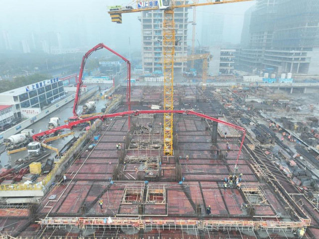 1月3日,河西金融中心项目塔楼及裙楼正负零板浇筑完成,比原计划提前了75天。为了确保工程进度,项目人员加班加点,节假日仍坚守岗位,运输车、塔吊和汽车泵等各种施工机械紧张作业,仿佛在进行一场与时间赛跑的“战斗”,最终保证了浇筑工作顺利完成。
